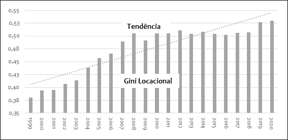 A concentração espacial da produção de leite no Rio Grande do Sul foi calculada a partir do Gini Locacional (GL), para o período de 1999 a 2020. O maior 𝐺𝐿 (0,53) e a maior área de concentração (α) foram encontradas para o ano de 2020, enquanto o menor 𝐺𝐿 (0,38) e a menor área são registrados foram para o ano de 1999. A Figura 3 apresenta a evolução da concentração espacial da pecuária leiteira.