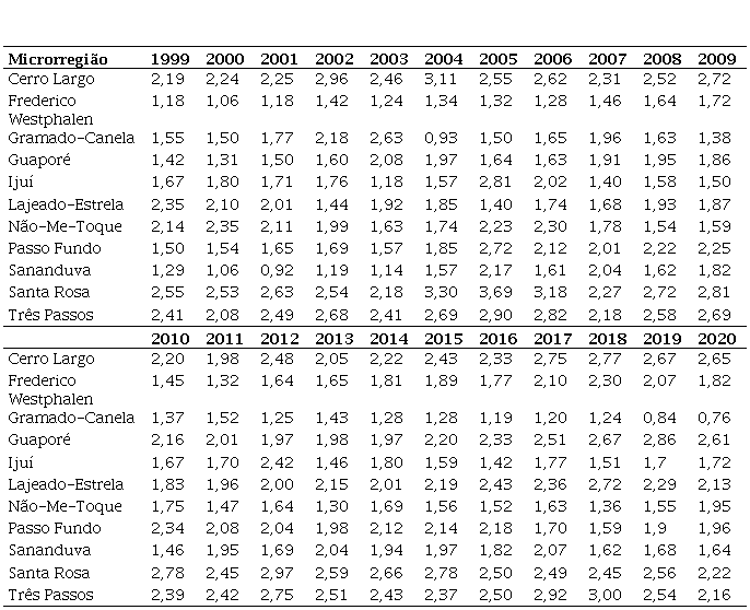 A crescente produção de leite no Rio Grande do Sul, no período 1999-2020, não ocorreu de forma homogênea, o que vem modificando o mapa geográfico da atividade no estado (Figura 2). A microrregião de Cerro Largo tornou-se a mais especializada na produção, sendo acompanhada, em ordem decrescente de importância, pelas microrregiões Guaporé, Santa Rosa, Três Passos e Lajeado-Estrela. Em contrapartida, Gramado-Canela e Não-Me-Toque, deixaram de ser altamente especializadas, com índices decrescentes a partir de 2003 e 2006, respectivamente.
