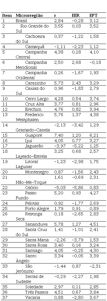 Em relação a produtividade, apenas duas microrregiões apresentaram retração, são elas: Campanha Meridional e São Jerônimo. Na Campanha Meridional houve uma retração de (-0,18% a.a.), entretanto, o aumento no rebanho (vacas ordenhadas), que foi de 2,68% a.a., compensou a perda de produtividade, e fez com que a microrregião apresentasse uma taxa média anual de crescimento da produção leiteira de (2,50% a.a.). A Tabela 2 também ilustra que, em São Jerônimo a queda de produtividade foi maior (-2,31% a.a.) e não foi compensada pelo aumento do rebanho (0,87% a.a.), o que resultou em uma queda na produção de leite de (-1,44% a.a.). Vale ressaltar que 18 microrregiões apresentaram diminuição no rebanho, sendo a queda mais expressiva na de Osório (EER = - 5,86% a.a.). Nessa microrregião ocorreu também a maior queda de produção de leite do estado, de - 5,03% ao ano.