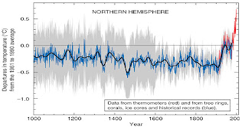 Em 1998, foi publicado na revista Nature um artigo de pesquisadores da University of Virgínia, liderados pelo cientista Michael Mann, contendo um gráfico sobre as flutuações de temperatura no Hemisfério Norte, entre 1400 a 2000, com base em dados de anéis de árvores (dendrologia), núcleos de gelo e corais. O famoso gráfico hockey stick (taco de hóquei) indicou o extraordinário aumento da temperatura neste Hemisfério e sua aceleração na década de 1950, o período da Grande Aceleração (intensificação de atividades antrópicas sociais e econômicas).