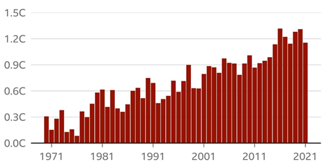 A evolução do clima vem sendo monitorada com rigor científico cada vez mais apurado. “Os dados de temperatura atuais vêm de muitas fontes, incluindo mais de 32.000 estações meteorológicas terrestres, balões meteorológicos, radares, navios e boias, satélites e observadores meteorológicos voluntários”, explica o redator científico da NASA, Alan Buis (2022). Desde a criação do IPCC, em 1988, são produzidos relatórios científicos periódicos e, excetuadas algumas publicações de caráter negacionista, a avaliação de diferentes organismos internacionais converge inteiramente quanto aos níveis de aquecimento global e às manifestações do desequilíbrio climático. O aumento da temperatura global da superfície da Terra é uma realidade fática indiscutível. As oscilações momentâneas devem ser lidas à luz da tendência geral. Como se nota na figura abaixo, a cada década as temperaturas estão em patamar mais elevado.