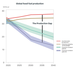 A linguagem mais incisiva do IPCC, entretanto, não encontra eco proporcional entre as elites econômicas e políticas, comprometidas majoritariamente com o status quo. Os relatórios das Nações Unidas sobre a lacuna de emissões e da produção de combustíveis fósseis vêm mostrando a discrepância entre os compromissos climáticos e o planejamento dos países. A distância é grande, como se vê na figura abaixo.
