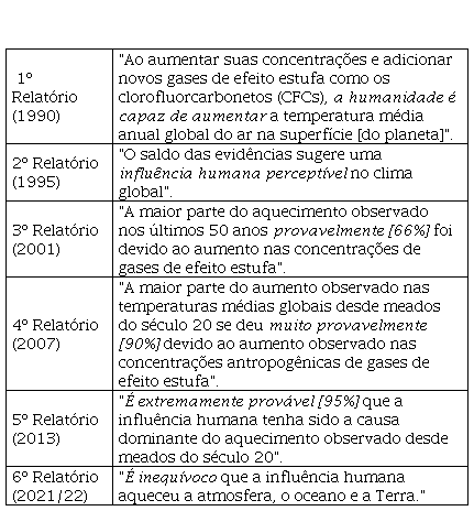 Os sucessivos relatórios do IPCC foram fundamentais para manter o tema do clima na agenda pública. As evidências fáticas contidas nos relatórios confirmaram os prognósticos dos modelos científicos apresentados em décadas anteriores. Isso levou o IPCC e a comunidade científica a um tom crescentemente enfático quanto à urgência de ações globais. Expressão disto foi a carta de mais de 11 mil cientistas, de 153 países, publicada em janeiro de 2020 na revista Bioscience (RIPPLE et al., 2020), reveladora do senso de urgência dos pesquisadores.