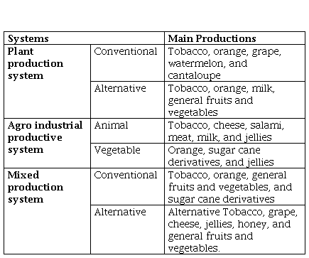There were different forms of management, cultural treatment, and predominant cultures in each production system (LIMA et al., 2005). As a result, the mixed and plant systems were subdivided into conventional and alternative.