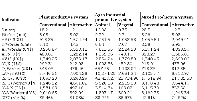 The income stratification as a result of the sales channel used (long or short) for the production flow allows us to infer that the income obtained from the sale in short channels paid better in the usable area (land) than in any productive system (Table 1). On the other hand, the income for available labor in the conventional plant system is higher (U$764.43) than in short channels only. This indicator was also high in the conventional mixed system (U$$ 84.28).
