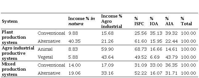 The animal agro-industrial system has the highest percentage of income obtained from the sale of products through short channels (Table 2) and tends to be related to production with higher added value, such as salami and cheese, sold in the local market. However, in the conventional and conventional mixed system of vegetables, participation is equivalent, both for short and long channels, as for income from pensions, leases, and/or rents.