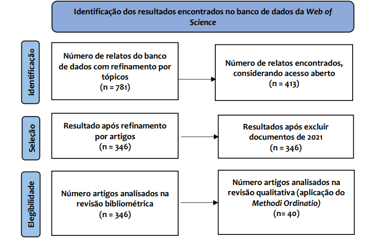 Assim, no dia 21 de junho de 2021, foram realizadas pesquisas, por tópico, na base de dados Web of Science, via Portal de Periódico CAPES e, após refinamento por acesso aberto e escolha dos artigos finais, com exclusão do ano de 2021, foram encontrados 346 artigos, exportados para as ferramentas Mendeley e RStudio, cujo resultado consubstanciou as análises de dados, conforme fluxograma Prisma (Fig. 1). O acesso ao Bibliometrix deu-se pelo RStudio, a partir dos seguintes comandos: install.packages("bibliometrix"), library(bibliometrix) e biblioshiny().