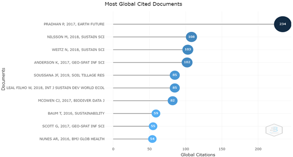 Na Figura 3 constam os autores e artigos mais citados. Os 5 artigos que tiveram o maior número de citações foram dos autores Pradhan et al. (2017) com 234 citações, seguidos por Nilsson et al. (2018) com 108, Weitz et al. (2018) com 103, Anderson et al. (2017) com 102 e Soussana et al. (2019) com 85.