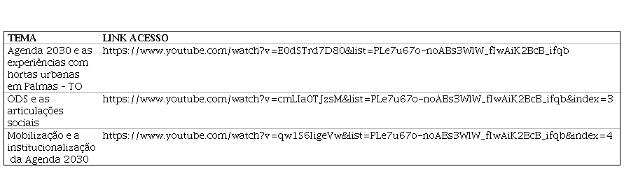 Neste aspecto, importante destacar experiências vivenciadas em ação de extensão universitária, intitulada Curso de Assessores Populares em ODS do Programa de Pós-Graduação em Desenvolvimento Regional da Universidade Federal do Tocantins (PPGDR/UFT), sob a responsabilidade da disciplina Seminários Interdisciplinares I e II, cujas atividades orientam mestrandos a trabalhar como multiplicadores em sustentabilidade. Deste modo, no decorrer das atividades, após receber os conhecimentos básicos sobre Agenda 2030, os ODS e suas metas, os discentes elaboram e executam práticas de formação social, com cursos transmitidos via EAD pela plataforma Eskada da Universidade Estadual do Maranhão e pelo canal do YouTube, conforme consta da Quadro 1.