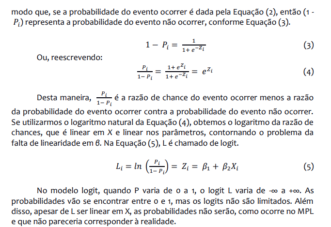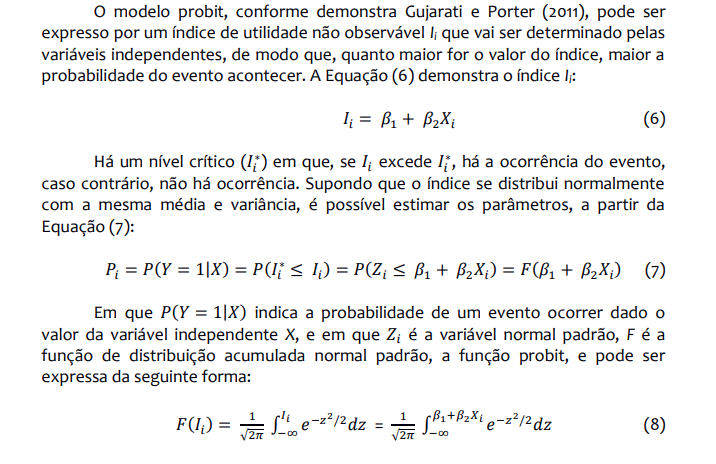 Os resultados obtidos a partir de logit e probit são similares, a diferença é que na distribuição logística a probabilidade condicional Pi se aproxima de 0 ou 1 mais devagar no logit em comparação com o probit. Desta maneira, os dois modelos poderiam ser utilizados, contudo, muitos pesquisadores preferem o modelo logit por sua simplicidade matemática.