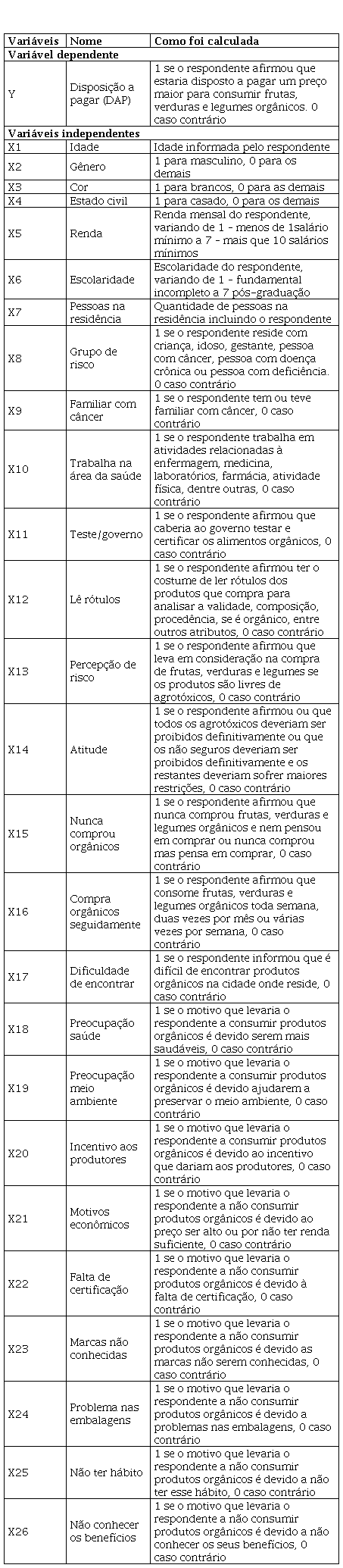 A influência do preço na disposição a pagar por orgânicos foi incluída através da variável motivos econômicos, onde o respondente informava os motivos que poderiam desestimular o consumo de orgânicos. Conforme aponta Mendes (2006), o preço é uma variável importante na decisão de comprar, e se espera que o sinal dessa variável seja negativa, ou seja, quanto maior o preço dos produtos orgânicos, menos dispostos a consumir são os respondentes.