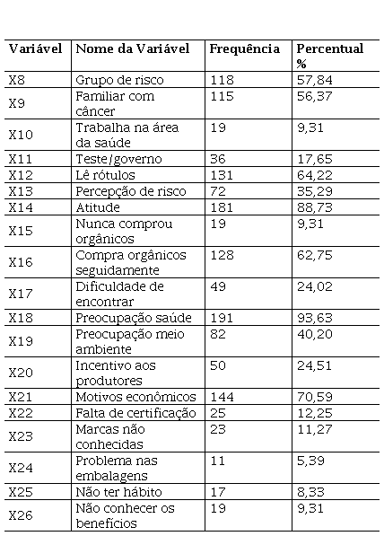 A variável grupo de risco foi construída com base em Mendes (2006) com objetivo de verificar o caráter altruísta do consumidor, que não só estaria interessado em maximizar a sua utilidade com base apenas nos bens/serviços que ele consome, mas também nos efeitos que esses bens/serviços possam ter sobre o bem-estar de terceiros. Pessoas com essas características seriam mais vulneráveis aos efeitos dos problemas dos agrotóxicos na alimentação. A variável atitude e percepção de risco também foi baseado em Mendes (2006).