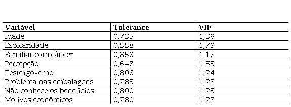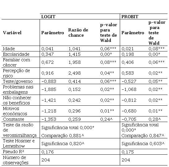 Através do teste de Wald as variáveis “idade”, “familiar com câncer” e “teste/governo” foram estatisticamente significativos a 10%. “Percepção de risco”, “problema nas embalagens”, “não conhecer os benefícios” e “motivos econômicos” foram estatisticamente significativos a 5% e “escolaridade” estatisticamente significativo a 1%. Dessa forma os coeficientes estimados são diferentes de 0 e prossegue-se com as análises.
