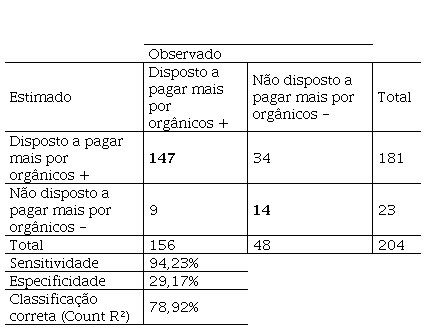 A Tabela 4 mostra a classificação dos modelos, para ambos logit e probit, pois esses resultados são iguais. Dos 156 respondentes que informaram estarem dispostos a pagar um preço maior por frutas, verduras e legumes orgânicos, os modelos acertaram 147, ou seja, a sensitividade do modelo foi de 94,23%. Em relação aos 48 que não estavam dispostos a pagar um preço maior o modelo acertou 14, isso representa uma especificidade de 29,17%. Pode-se concluir que esses modelos são melhor para prever os consumidores dispostos a pagar um preço maior e não os que não estão dispostos a pagar. No geral o modelo conseguiu prever corretamente 161 observações, representando 78,92%.