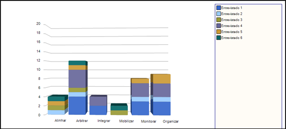 O Gráfico acima destaca a relação entre o quantitativo de trechos que apresentaram uma perspectiva positiva nas falas dos entrevistados (eixo X), para cada função da governança (eixo Y), sendo cada entrevistado representado por uma cor. Desta forma, destaca-se a função arbitrar como a mais preponderante dentre todas as funções, seguida de organizar e monitorar. Ademais, foi possível identificar as palavras mais frequentes que os entrevistados relacionaram às funções da governança, com destaque para “discussão”, “técnico”, “informa”, “visita” e “assistência”. Desta forma, pode-se perceber que cada uma dessas palavras apresenta influências com as funções proeminentes exercidas na rede, apresentando relação positiva a execução de cada função da governança.