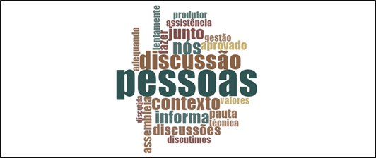 Diante da figura acima, é possível perceber que, dentre as palavras mais citadas nos discursos dos entrevistados em relação aos resultados da governança e suas respectivas categorias, estão “pessoas”, “discussão”, “nós”, “juntos” e “contexto”. Desta forma, evidencia-se a incorporação do trabalho em conjunto entre coordenação e membros, refletindo da humanização dos processos, na qual é correspondente aos conceitos e práticas da agroecologia, e principalmente da gestão da rede.