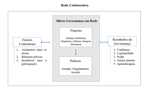 Apesar dos esforços direcionados para esse tema, ainda há lacunas específicas sobre a governança de redes, principalmente no que se refere a compreensão de como os modos de governança podem ser operacionalizados e aprimorados, de maneira a oferecer contribuições eficientes aos líderes da rede, em relação as atividades cotidianas necessárias para promover um ambiente colaborativo. Neste contexto, Wegner e Vershoore Filho (2021) propõem um framework que aborda a micro governança em redes colaborativas, partindo do pressuposto de que as funções e práticas desempenhadas por redes líderes de trabalho estimulam a cooperação entre os membros da rede. A estrutura proposta pelos autores conta com 17 categorias de análise, distribuídas nas dimensões: fatores contextuais, as funções, práticas e resultados da governança. A principal diferença entre a governança e a micro governança refere-se ao fato de que enquanto a primeira tem um viés mais direcionado para aspectos de relações externas da rede, a segunda foca em aspectos internos.