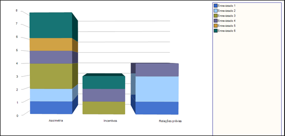 O Gráfico acima apresenta a relação entre as variáveis desta dimensão (eixo y) com o quantitativo de falas e posicionamentos ditos pelos entrevistados que se apresentaram positivos e aderentes aos respectivos conceitos (eixo X), sendo cada entrevistado representado por uma cor. Desta maneira, nota-se que dentre as categorias desta dimensão, a assimetria esteve presente no discurso de todos os entrevistados, com destaque para a adesão do contexto agroecológico, seguido da categoria de relações prévias e incentivos que influenciam mais fortemente a estrutura e o comportamento da rede. Ademais, foi possível identificar as palavras mais frequentes que os entrevistados relacionaram com os fatores contextuais, são elas: “agroecologia”, “comercialização”, “econômico”, “terra” e “CPT” que representa a organização de apoio para a constituição e desenvolvimento.