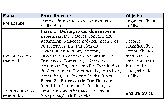 As entrevistas foram realizadas entre julho e setembro de 2020, ao visitar as propriedades de alguns membros da rede, utilizando uma adaptação do roteiro semiestruturado de entrevista. Após a aplicação e transcrição das entrevistas, foi utilizado a técnica de análise de conteúdo, na qual buscou-se correlacionar as falas dos entrevistados com as definições das dimensões e categorias a respeito do nível micro de governança de rede colaborativa. A análise de conteúdo do presente estudo, que tem por dados as entrevistas realizadas tomando como base o roteiro semiestruturado, segue as etapas de aplicação desse método conforme o Bardin (2016), são elas: a) pré-análise; b) exploração do material; e c) tratamento dos resultados.