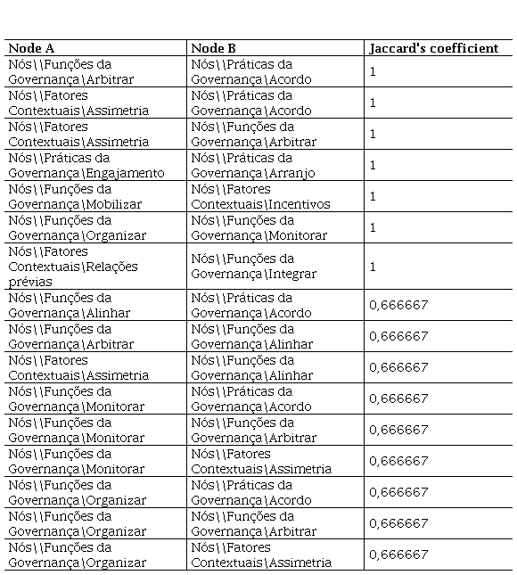 A partir do processo de codificação, ou seja, a seleção dos trechos aderentes as dimensões e categorias, foi possível cruzar todas as categorias entre si, de maneira a destacar as que possuem maior similaridade. De uma maneira geral, a coluna “Node A” apresenta um conjunto de categorias, dentro das respectivas dimensões, na qual é confrontada com um segundo conjunto de categorias, “Node B”. Desta forma, é possível identificar que as diferenças existentes entre os participantes possuem significativas relações com o uso da função arbitrar e a prática de acordo para governar a rede estudada. Além disso, a análise de cluster acima mostra padrões interessantes entre as categorias do framework. Ao considerar o parâmetro de interpretação do coeficiente, percebe-se algumas relações fortes, tendo o coeficiente igual ou próximo de 1, são eles: relações prévias e a função integrar, indicando que as relações anteriores as redes colaboram para o bom desempenho da integração dos participantes nas atividades da rede; Assimetria e a função arbitrar; e por último, a categoria incentivo ou restrições com a função mobilizar.