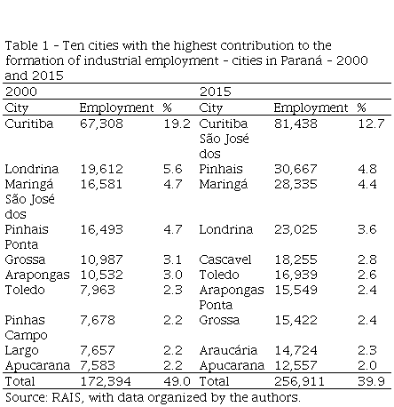 It seems relevant to emphasize a spatial effect on the industrialization dynamics in Paraná. Great part of the sectors presented this characteristic and, therefore, one can infer that the productive process induction at a specific location in certain space might generate tensions and repercussions that also affect the industrial process in its neighborhood.