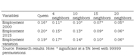 Another important element observed refers to the existing correlation between the employment distribution maps and the variation of work positions (Figure 2), which tends to show high values mainly in spaces where the initial employment was high. This fact suggests an intensification in the composition of existing agglomerates in Paraná, with spillovers to the neighboring towns. This evidence was confirmed by the bivariate Moran I in Table 4.