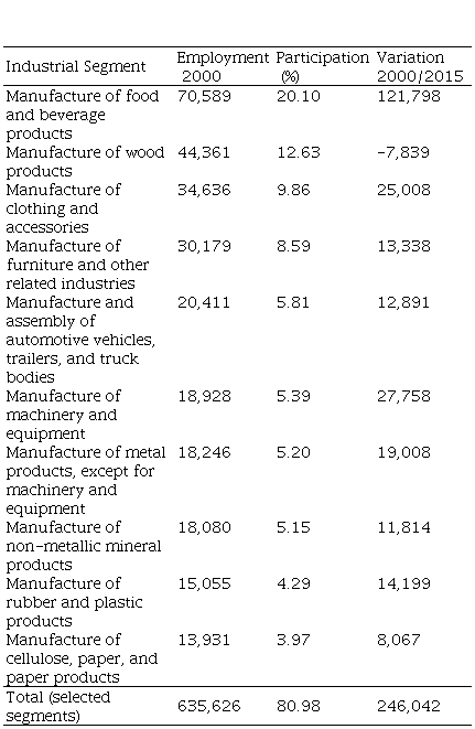 From these hypotheses, the importance of economies of specialization and diversification was tested in the industrial dynamics of the cities in Paraná. To achieve this aim, the ten industrial segments with larger participation in the industrial employment in 2000 were analyzed. They were responsible for 80.98% of the industrial jobs in Paraná (Table 3). Altogether these sectors were responsible for the creation of 246,042 work positions between 2000 and 2015, in which, except for the “wood product manufacture”, all sectors increased their job offer, becoming more dynamic throughout the period.