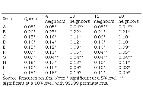 A superficial analysis of the spatial distribution of industrial jobs in 2000 and 2015 suggests that the distribution of this variable is not random in space, on the contrary, it presents a strong spatial component. This means that one town might be more likely to become industrialized if it is geographically located close to an industrialized town; and might show lower probability of becoming industrialized if it is geographically isolated. This hypothesis is confirmed by the Moran I coefficient (Table 2). The values are seen to be positive and statistically significant, in all conventions tested, inferring that on average the cities with high numbers of industrial employment were surrounded by neighboring towns with high values (and vice-versa). At the same time, when comparing the coefficient values from 2000 against 2015 an increase is observed, indicating a process of industrial spatial concentration intensification in specific points of the State.