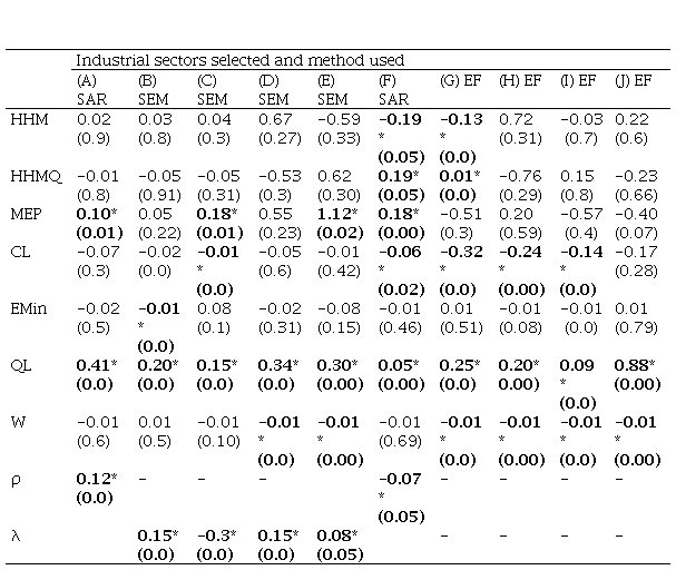 Where: E refers to the employment; t is the year; i is the industrial sector under evaluation; QL is the locational quotient; HHM is the Modified Hirschman-Herfindal Index; CL is the local competition; W is the salary; MEP refers to the change in the employment in industry i in the State.