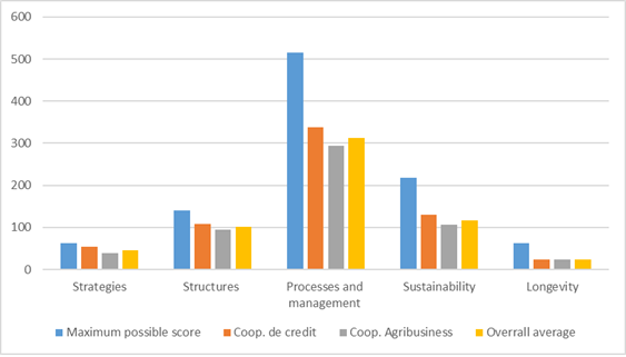Regarding the processes and management dimension that could have a maximum score of 515.63 points, credit cooperatives obtained an average score of 337.51 (65.46%), in the case of agricultural cooperatives the average score was 293.45 points (56.91%). The difference between the branches of the cooperatives was small (8.54%) in terms of processes and management. When all cooperatives are analyzed together, on average they obtain 313.03 points (60.71%) of the total that could be obtained.