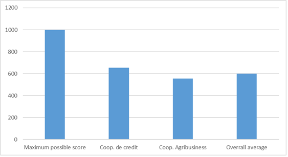 Graph (2) shows a comparison of the averages obtained in the two cooperative branches in relation to the maximum score that both could reach. Visibly, the average of credit cooperatives was higher than the average obtained from agricultural cooperatives. The overall average was 599.73 out of the 1000 possible points, that is, it reached only 59.97% of the total with regard to the adoption of corporate governance practices.