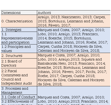 Studies that found similar results regarding the dimensions of processes and management, represented by the categories, Code of Conduct, Effectiveness of Governance Bodies, Executive Management, Management and Performance, Inspection and Control, which meet the results of this research were found in Zylbersztajn (1994), Figueiredo Neto, Mendonça, Faria (2005), Marques and Costa, 2007; Oro, Frozza, Eidt (2008), Araújo (2010); Lobo (2010); Rossetti, Andrade (2012), Araújo (2013); Francisco (2014); Carpes and Cunha (2018); Schwach and Assis (2015); Bortoluzzi, Leismann and Johann (2016); Santos, Santos and Sehnem (2016); Fávero (2017); Picchi (2017); Roehe (2017).