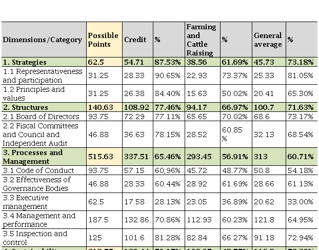 It notes that the cooperatives as a whole had better scores in alignment around Representativeness and participation and Principles and values, due to the higher score obtained in the dimension "Strategy", which contributes to better corporate cohesion, and to the continuity of control of the cooperative. It is important to note that credit cooperatives stand out in the “Strategy” dimension, showing greater adherence to corporate governance practices in relation to agricultural cooperatives, corresponding to a 25.83% percentage variation between the branches.