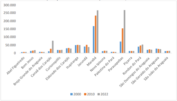 Os dados da demografia no gráfico a seguir apresenta a população geral constituída pelos dados disponibilizados pelos Censos de 2000, 2010 e 2022, do IBGE. Com base nesses dados, na região de integração de Carajás1, Marabá possui centralidade da hierarquia urbana regional até os dados de 2010 do Censo, com 233.669 mil habitantes. Porém a partir do Censo de 2022 foi superada em número de habitantes por Parauapebas, que saltou de 153.908 mil habitantes em 2010, para 267.836 mil habitantes em 2022. No município de Canaã dos Carajás o Censo de 2010 registrou 26.716 mil habitantes, porém a partir do Censo de 2022 foi registrado 77.079 mil habitantes, assumindo posição de relevância na hierarquia urbana regional ao lado de Parauapebas e Marabá.