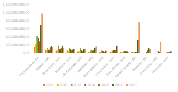 O Pará se consolidou como o maior receptor dos recursos do CFEM devido a especialização de extração de minérios, com o pioneirismo o Projeto Grande Carajás de 1982, a partir da prospecção e o início das atividades em Parauapebas e Marabá. Na seriação histórica de 2008 a 2020, Parauapebas liderou até o ano de 2018, perdeu a liderança em 2019, na recepção do CFEM, por conta do projeto S11D em Canaã dos Carajás, no qual passou a liderar a arrecadação desse tributo.