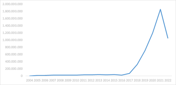 No gráfico 3, observa-se que Canaã dos Carajás iniciou a sua arrecadação de recursos provenientes do CFEM em 2005, ampliou de R$ 14.834 para R$ 38.597 milhões, em 2015. Porém, com o início do funcionamento do projeto S11D em 2017, houve a abrupto crescimento de arrecadação do CFEM, de R$ 71.425 milhões para R$ 320.722 milhões em 2018, representando em seu primeiro ano de extração de minério da S11D, o aumento de 350%. Em 2021, a arrecadação alcançou seu maior valor registrado até 2022, R$ 1.857 bilhão, porém em 2022 recuou para R$ 1.060 bilhão. Esses dados reforçam a capacidade e escala de extração do minério em Canaã, de modo que a composição do orçamento público municipal passou a ser dependente do CFEM e atualmente arrecada impressionantes marcas.