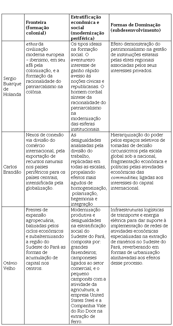 As categorias analisadas nesses autores foram: fronteira, compreendida como oriunda da formação econômico e social do Brasil; estratificação econômica e social como oriundas da modernização periférica e posicionadas na divisão internacional do trabalho como exportador de commodities; e as formas de dominação, compreendida como a síntese do subdesenvolvimento em países periféricos relacionadas à concertação das tomadas de decisões centralizadas em agentes que representam as frações do capital. Nos autores foram exploradas às ideias forças que convergem para as categorias analíticas anunciadas.