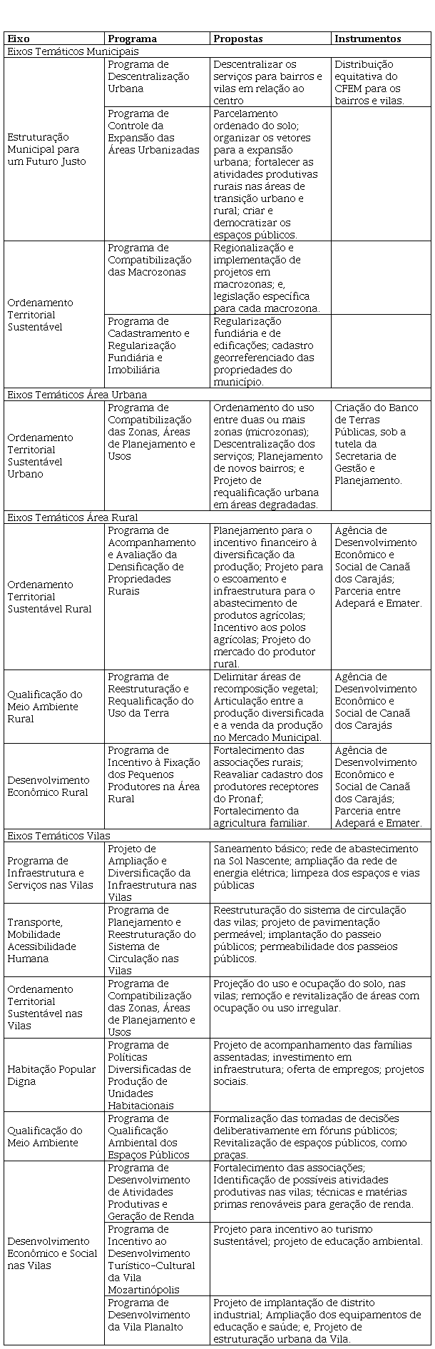 O quadro analítico do Plano Diretor Participativo de 2007 é dividido em eixos, em cada um deles há programas balizados pelas propostas e os instrumentos de execução. Foi priorizado os eixos dos programas que estão relacionados ao ordenamento territorial da área rural de Canaã de Carajás e com fundamentação para a sua execução pelos instrumentos mobilizados. Por conta disso, restringiu-se o campo de análise nas ações da prefeitura que podem realizar mudanças na estrutura territorial.