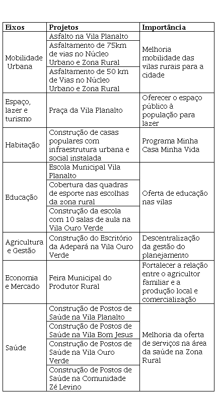 No segundo movimento de análise o enfoque se deteve em identificar no planejamento urbano do governo municipal de Canaã dos Carajás as ações organizadas para o ordenamento territorial rural, em específico da Vila Planalto, Vila Serra Dourada, Vila Bom Jesus, Vila Feitosa, Vila Ouro Verde e Vila Mozartinópolis. A metodologia aplicada nessa análise foi identificar no Plano Diretor as ações destinadas ao ordenamento territorial da área rural no município. A análise do Plano Local de Habitação de Interesse Social (PHLIS) de Canaã dos Carajás perpassou em identificar as ações destinadas à habitação nas vilas rurais, com ênfase nos recursos financeiros aplicados nos projetos pela prefeitura municipal de Canaã dos Carajás, como baliza para interpretar as ações efetuadas pelo governo municipal.