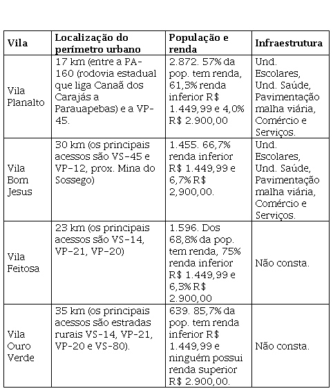 As condições deflagradas pelos dados das vilas rurais de acordo com o PLHIS evidenciam a vulnerabilidade e assimetrias territoriais não registradas pelos indicadores econômicos. Na Vila Planalto, Vila Bom Jesus, Vila Feitosa e Vila Ouro Verde a renda da população é menor do R$ 1.449,99, e as infraestruturas são precárias, além de estarem na linha de frente do conflito pela luta pela terra com os agentes representantes da produção agropecuária e da Vale pela extração de minério.