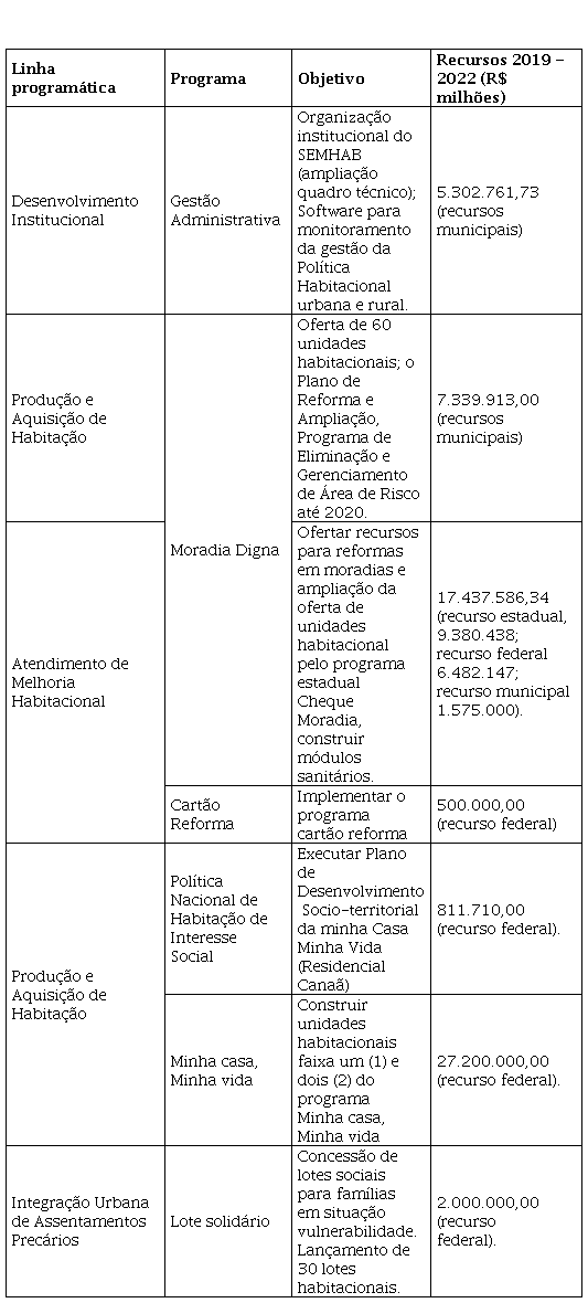 Da linha programática de programas pelo PHLIS, apenas dois possuem autonomia administrativa para ser implementados, Gestão Administrativa e Moradia Digna, pois os recursos estão relacionados ao orçamento municipal. Os demais programas, como o Cartão Reforma, Política Nacional de Habitação de Interesse Social, Minha casa, Minha vida e Lote solidário, estão lastreados pelos recursos federais. Conforme identificado nos documentos institucionais Plano Diretor, as propostas implementadas segundo as informações do documento Diagnóstico socioeconômico de Canaã dos Carajás foram locadas em infraestrutura social, na construção de escolas e postos de saúde, e na pavimentação de ruas de acesso ao Núcleo Urbano. Os recursos implementados pelo PHLIS de Canaã dos Carajás em habitação tiveram o maior percentual concedido pelo governo federal, 63,65%, o governo municipal participou com 23,46% dos recursos concedidos e o governo estadual apenas com 15,5%. De modo que, dada precariedade da habitação nas vilas rurais, a descentralização administrativa enunciada pelo Plano Diretor é reduzida, centraliza a maior percentual dos recursos em programas do governo federal em Canaã dos Carajás, em programas relacionados ao ordenamento territorial e a habitação.