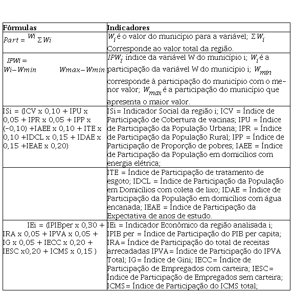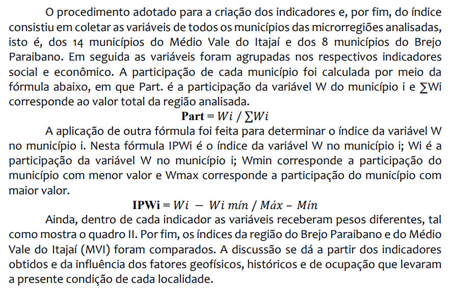 O procedimento adotado para a criação dos indicadores e, por fim, do índice consistiu em coletar as variáveis de todos os municípios das microrregiões analisadas, isto é, dos 14 municípios do Médio Vale do Itajaí e dos 8 municípios do Brejo Paraibano. Em seguida as variáveis foram agrupadas nos respectivos indicadores social e econômico. A participação de cada município foi calculada por meio da fórmula abaixo, em que Part. é a participação da variável W do município i e ∑Wi corresponde ao valor total da região analisada.