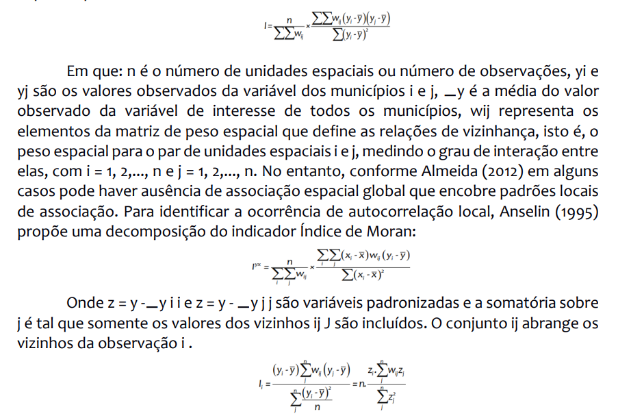 A presença de autocorrelação espacial, medida estatística que avalia a relação entre os valores de uma variável em diferentes locais de uma determinada área geográfica, indicando a existência ou inexistência de padrões de similaridade ou dissimilaridade espacial nos dados, é detectada por meio de estatísticas globais, nas quais os dados são analisados de maneira generalizada, avaliando a associação espacial de uma região como um todo, indicado o nível de interdependência geográfica entre as variáveis de interesse, sua natureza e o grau de relação - Índice de Moran Global. O índice situa-se entre -1 a +1, testando a hipótese nula de que há independência espacial ou ausência de autocorrelação espacial (I=0). No caso de I≠ 0 existe uma dependência espacial ou presença de autocorrelação. Valores positivos e significativos assinalam uma dependência ou autocorrelação espacial positiva, e valores negativos e significativos indicam a presença de uma autocorrelação ou dependência espacial negativa, isto é, oposta em relação aos vizinhos. O índice é expresso por: