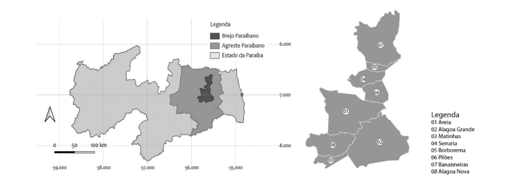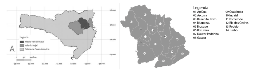 Partindo-se dessa premissa, dos conceitos de cidades médias, trazendo à luz as marcas históricas nas formações regionais do Brasil, e suas implicações no desenvolvimento econômico e social, dois recortes territoriais foram descritos e submetidos à análises de correlação espacial por fim comparados, foram eles: A região da Paraíba e Santa Catarina, a partir das regiões Brejo Paraibano - PB e Médio Vale do Itajaí -SC (Figuras 1 e 2). A escolha dos recortes territoriais se dá pelas diferenças geofísicas e históricas das regiões. O comparativo proporciona a aferição de como esses fatores implicam em maior ou menor correlação espacial entre as cidades pequenas, bem como a significância da cidade média sobre a região.