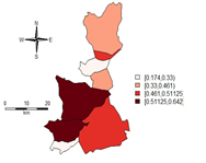 O mapa de quartis para o Brejo Paraibano apresenta os municípios a partir de divisões do IDSi. A cor mais escura é usada para representar os valores mais altos e a cor mais clara é usada para representar valores mais baixos.