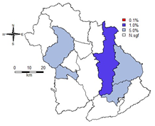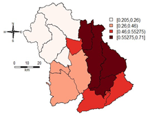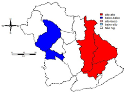Havendo a presença de clusters na região, nota-se uma relação intrarregional. Quando a relação é homogênea, ou seja, uma relação de crescimento conjunto do índice de desenvolvimento socioeconômico, políticas públicas em qualquer ponto do cluster auxiliam o desenvolvimento de todo o cluster. A relação heterogênea, no caso do desenvolvimento socioeconômico e DR não é esperada, pois dificilmente políticas públicas em uma municipalidade implicarão negativamente na municipalidade vizinha. Por fim, um último esforço é realizado ao verificar a significância do índice da cidade média em relação as demais. Trata-se do uso do índice de Moran Local (LISA Map) para identificar a cidade que mais possui influência na região analisada. Espera-se um índice alto de significância para cidades consideradas médias, ou seja, realmente influenciam o cluster a que pertencem.
