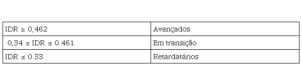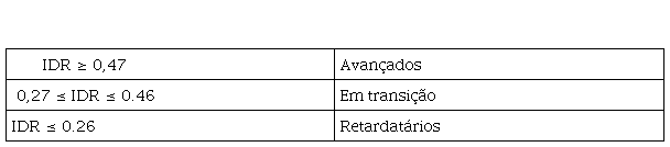 Os quadros a seguir apresentam as classificações de IDSi utilizadas, bem como os intervalos de valores do IDSi correspondentes a cada classificação para as duas regiões em estudo: