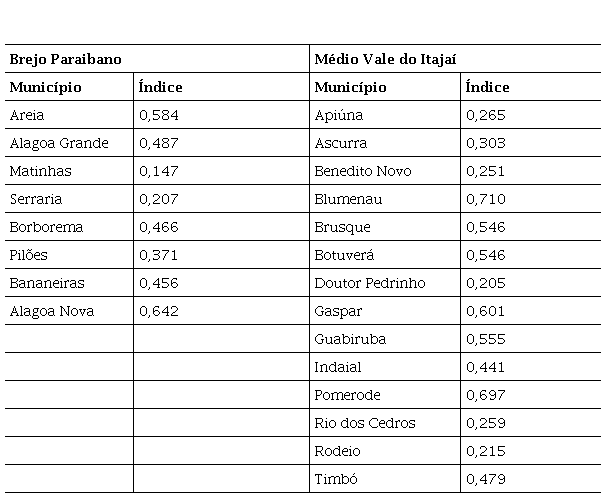 Quanto às classificações no contexto intrarregional, no Brejo Paraibano os municípios de Areia, Alagoa Grande, Alagoa Nova e Borborema tiveram o resultado do índice como avançado. Já no MVI os municípios de Blumenau, Brusque, Botuverá e Gaspar tiveram essa mesma classificação. Os municípios de Pilões no Brejo Paraibano e de Ascurra e Apiúna no MVI foram classificados como em transição e os municípios de Matinhos e Serraria (Brejo Paraibano) e Benedito Novo e Doutor Pedrinho (MVI) foram classificados como retardatários. A aplicação do Índice de Moran Global para o Brejo Paraibano não apontou autocorrelação espacial, ou seja, não há correlação entre os valores do índice em um município e os valores das variáveis das localidades vizinhas. Já no caso da aplicação para o MVI foi encontrada correlação espacial, ou seja, formação de clusters, tanto AA quanto BB, o que indica associação espacial homogênea. Padrões heterogêneos de associação não foram encontrados.