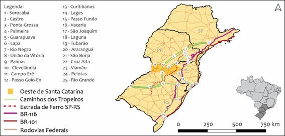 Enquanto isso, a Coroa Portuguesa caracterizou estes espaços como “terras devolutas”, entendendo que estavam vazias e carentes de colonização e incentivou a apropriação do espaço para cultivo e estabelecimento de limites territoriais mais precisos. Por conta da parca conexão do Oeste Catarinense com o litoral e, portanto, das cidades, onde o modo de vida é disciplinado por Estado e Religião, os primeiros habitantes não indígenas da região conformaram a etnia hoje entendida como cabocla. Esta população, classificada então como inadequada ao modo de vida urbano e “civilizado”, era composta por descendentes de portugueses, paulistas, pessoas escravizadas, ou recentemente libertas, indígenas destribalizados e europeus (MARTINS; WELTER, 2019). Iniciam-se assim interações comerciais entre tropeiros e caboclos, os quais passam a comercializar o excedente de sua produção com os viajantes, consolidando ainda mais os pontos de parada e as rotas mercantis, de tal forma que, atualmente, diversas rodovias como a BR-116 e a BR-101 sobrepõem estes percursos (Figura 1)