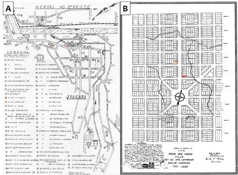 De forma distinta à Joaçaba, Chapecó apresenta um plano urbanístico bem estruturado, com uma mescla entre o traçado radial central e o ortogonal. O projeto (Figura 6B) foi idealizado por um dos colonizadores de maior atuação na região, Ernesto F. Bertaso, que demarca lotes para prédios públicos no núcleo da planta, para onde todas as ruas convergem, além de praças, na proposta da cidade (NODARI, 2009).